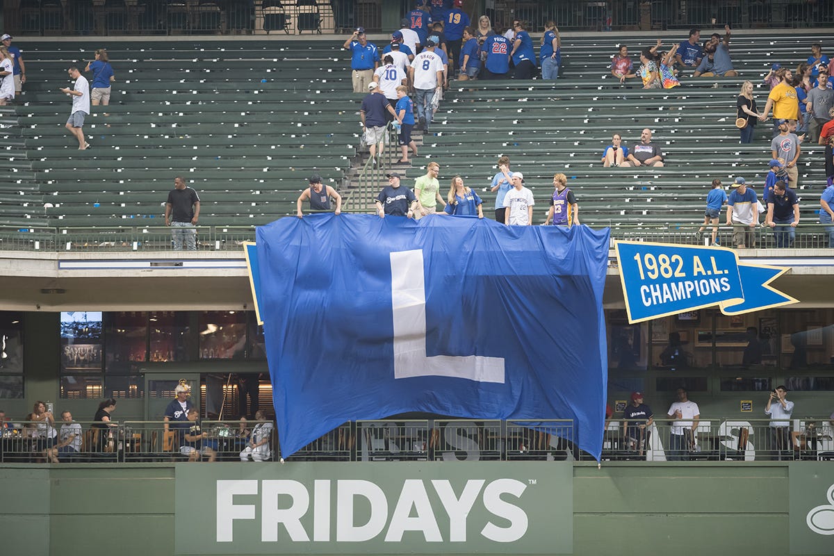 giant l flag unfurled in left field after brewers beat cubs